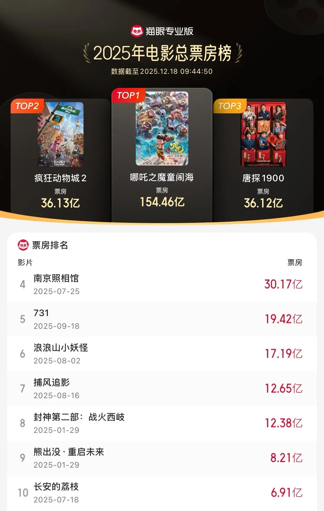 《哪吒之魔童闹海》:154.46 亿《纵脱动物城 2》:36.13 亿《唐探 1900》:36.12 亿《南京摄影馆》:30.17 亿《731》:19.42 亿《浪浪山小魔鬼》:17.19 亿《齐东野语》:12.65 亿《封神第二部:战火西岐》:12.38 亿《熊出没・重启当年》:8.21 亿《长安的荔枝》:6.91 亿据IT之家此前报说念,迪士尼电影官方在 12 月 16 日秘书,《纵脱动物城 2》秘书延迟放映至 2026 年 1 月 25 日。官方还共享了由导演拜恩・霍华德十分绘图的新年贺图。