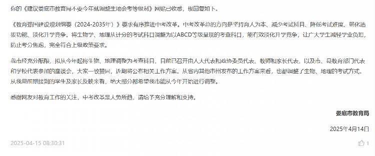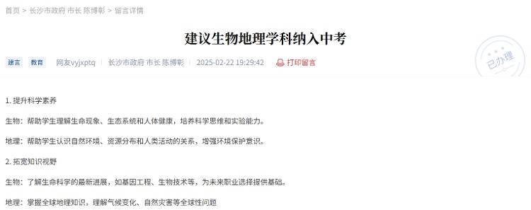 2025年3月,江西赣州市考验磨练中心也收到了一则对于地舆生物不再计入中考总分的建议。