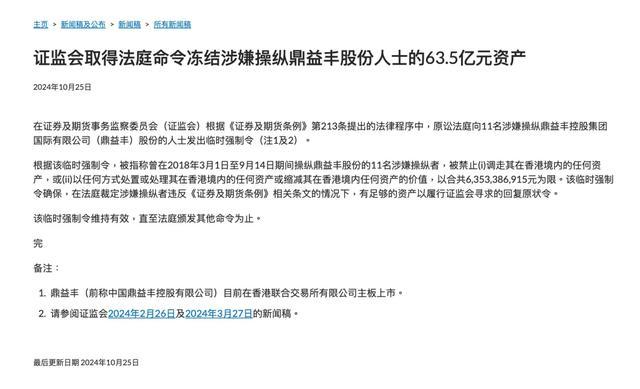 10月25日,香港证监会发布音书称,凭证《证券及期货条例》第213条提议的法律要领,原讼法庭向11名涉嫌把持鼎益丰股份的东谈主士发出临时强制令。
